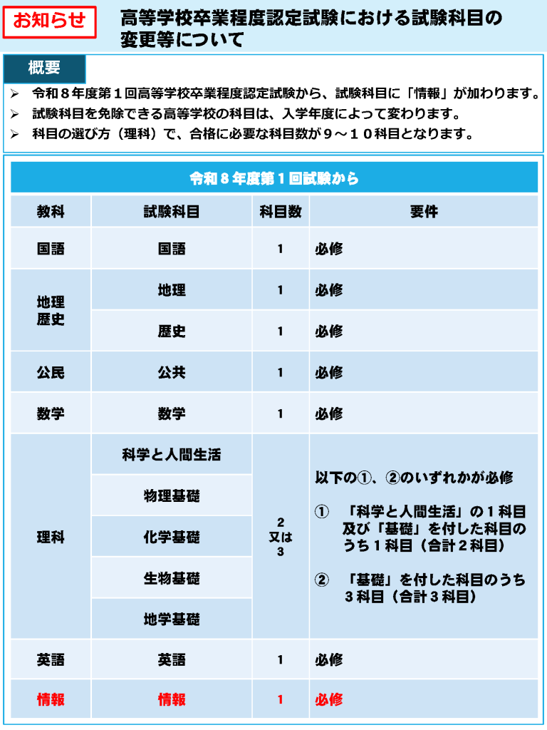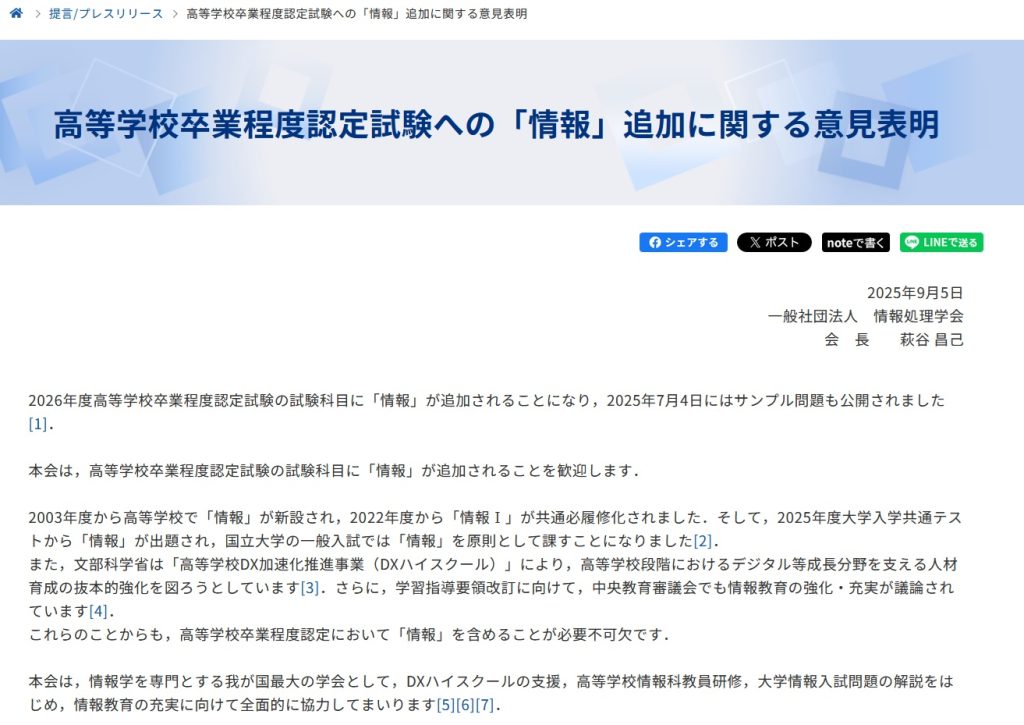 高等学校卒業程度認定試験への「情報」追加に関する意見表明