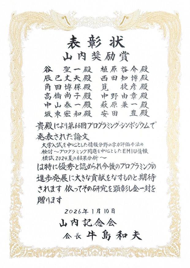 第66回プログラミング・シンポジウムにおける「大学入試を中心とした情報分野の学力評価手法の検討~プログラミング問題を中心としたEMIU情報模試2024夏の結果分析~」の研究発表が、第67回プログラミング・シンポジウムにて山内奨励賞を受賞しました。