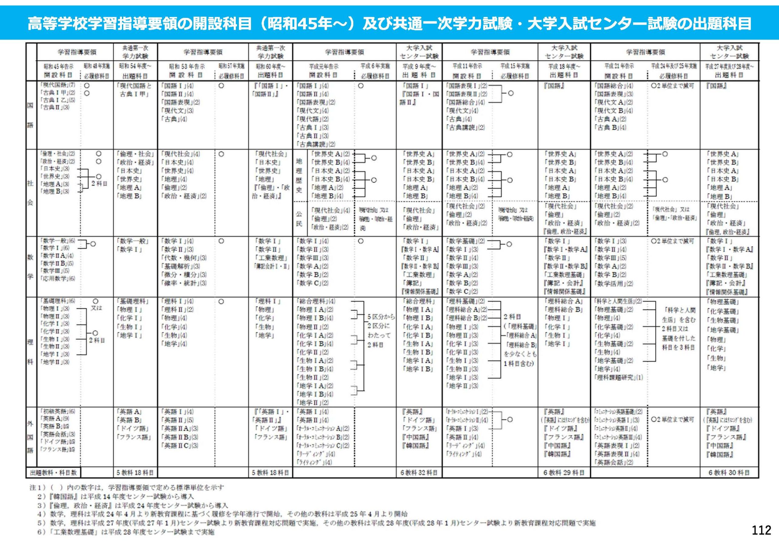高等学校学習指導要領の開設科目(昭和45年~)及び共通一次学力試験・大学入試センター試験の出題科目