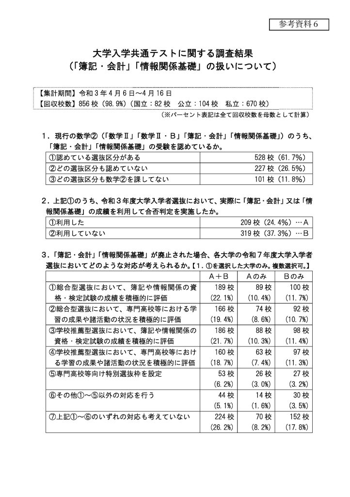 大学入学共通テストに関する調査結果(「簿記・会計」「情報関係基礎」の扱いについて)